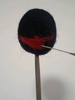 オレンジと赤を混ぜた羊毛を細く撚って刺し口の線を描きます