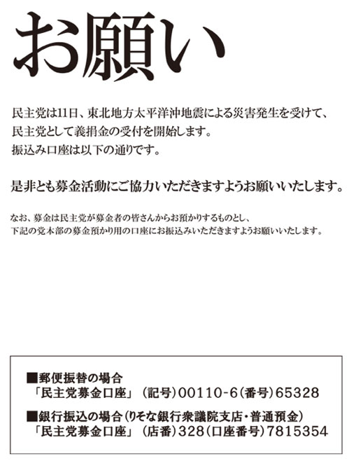 ■民主党 東北地方太平洋沖地震災害募金