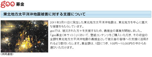 gooでは、被災された方々を支援するため、義援金の募集を開始。「goo募金」において、壁紙を購入することによりその収益の全額を東北地方太平洋沖地震の義援金として被災者の皆様への支援に活用されるよう寄付する。募金額は、1回につき100円~10,000円の中から選択できる。