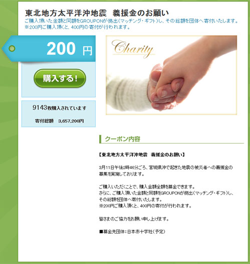 宮城県沖で起きた地震の被災者への義援金募集を実施している。200円からクーポンを購入でき、200円購入すると400円の寄付が日本赤十字社(予定)に行われる。
