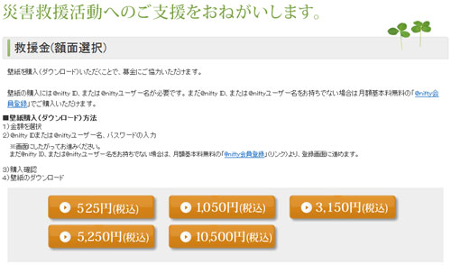 壁紙を購入(ダウンロード)することで、募金に協力できる。募金額は、1回につき525円~10,500円の中から選択できる。